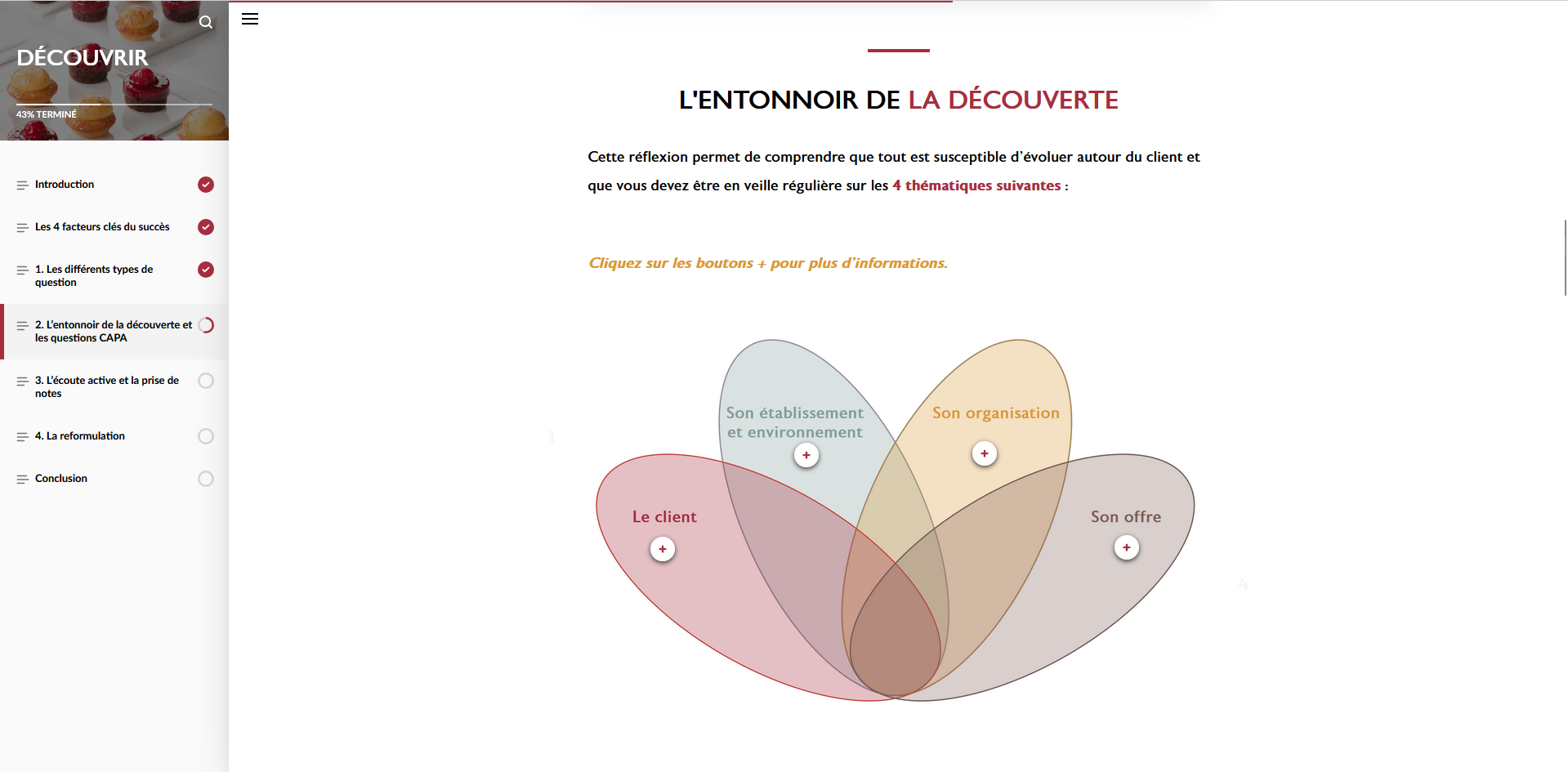 Le module apporte une vision moderne de la vente, centrée sur la création de valeur et la fidélisation, tout en outillant les apprenants pour transformer la découverte client en un véritable levier d’engagement.